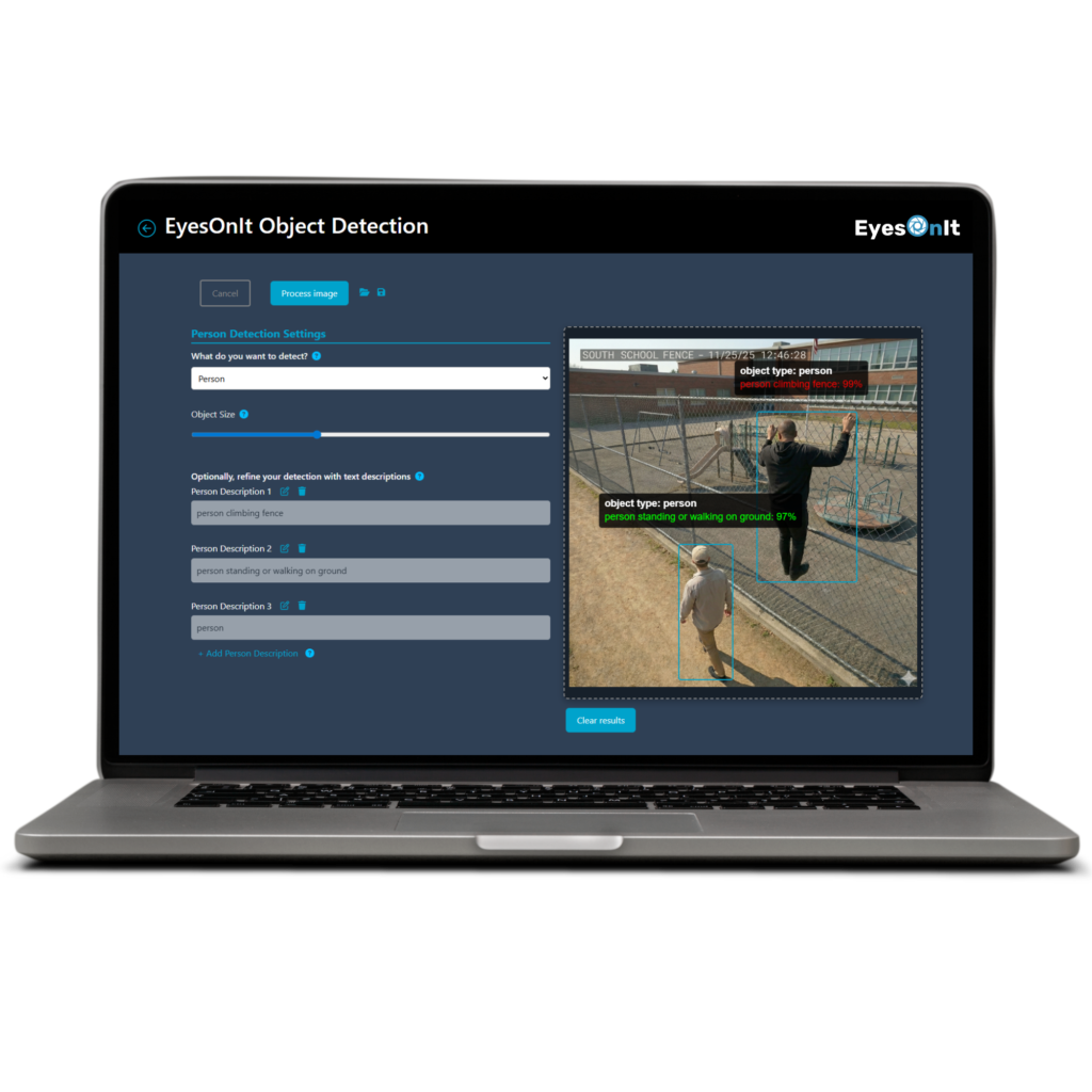 EyesOnIt uses computer vision and patent-pending natural language forensic search technology to process live or archived video streams. Users describe what they want to detect using plain English—such as “person climbing fence” or “vehicle stopped in lane”—and EyesOnIt identifies the event with confidence scoring and sends immediate alerts. The system runs on-site for low-latency, low-bandwidth operation and keeps your video data private.