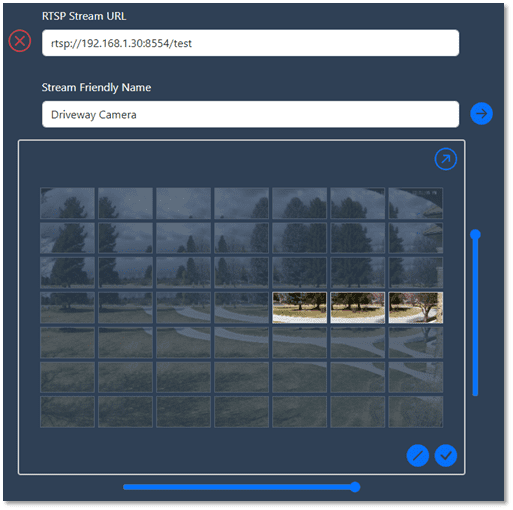 The video configuration UI allows you to tile and mask the input stream just like you can with an individual image. You can use the scrollbars to create tiles in rows and columns, and then you can select the tiles for your mask. We’re going to detect vehicles on the driveway when they stop in front of the sidewalk, so we’ll create our tile mask as shown here: